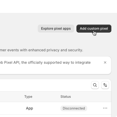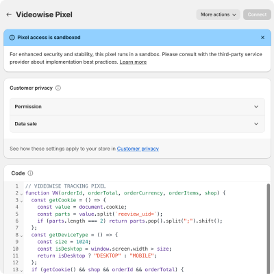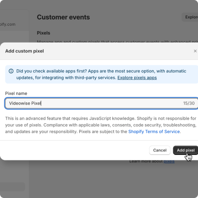 If your Shopify version supports web pixels go to “Settings -> Customer events” and click the “Add custom pixel”. Give the new pixel a name like “Videowise Pixel” and add the following pixel code: